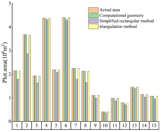 To determine the actual area of the experimental plots, a land measurement instrument was used for onsite measurements. Upon the completion of the measurements, the perimeter and area of each plot were recorded, with the measured area designating the actual area of the plots. The areas of the experimental plots calculated via the computational geometry method, simplified rectangular method, and triangulation method were compared with the actual area obtained with the measurement instrument, as illustrated in Figure 6. The areas of the experimental plots calculated using the computational geometry method and the triangulation method were in close agreement with the actual areas and were significantly more accurate than those obtained using the simplified rectangular method.