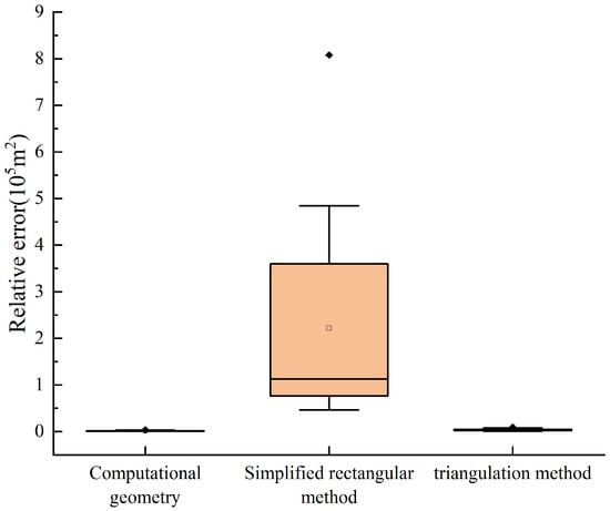 As illustrated in Figure 7, the comparison of area calculation method was shown, where the maximum relative errors for each method were clearly depicted. Specifically, the geometric method achieved a maximum relative error of only 0.08%, demonstrating its high accuracy. In contrast, the simplified rectangular method had a significantly higher maximum error of 22.70%, indicating a much less precise estimation. The triangulation method, with a maximum relative error of 0.22%, performed better than the rectangular method but was still less accurate than the geometric method. Notably, both the geometric and triangulation methods resulted in area errors of less than 666.67 m2, which satisfied the criteria for dividing sampling units. While the geometric method provided the highest accuracy, its relatively low efficiency made it less practical for large-scale implementations. On the other hand, the triangulation method, with its operational simplicity and ease of implementation for batch processing, was ultimately selected as the preferred approach for area calculations.