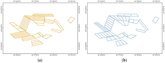 Fifteen agricultural fields were divided via two methods on the basis of the long side (Figure 8a) and short side (Figure 8b) of triangles. This process resulted in 78 parcels, with areas ranging from 66,700 to 133,400 m2. In this study, two types of farmland plots were selected simultaneously to verify the accuracy of the method of farmland plot division. In practical applications, the selection of an appropriate division method should be based on the cultivation orientation of the plots.
