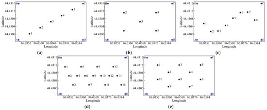 Rendering of the two-dimensional coordinates of sampling points (The upper letters represent the plot boundary corner points, and the numbers represent the sampling point numbers): (a) diagonal method; (b) plum blossom method; (c) S-shaped method; (d) checkerboard method; (e) zigzag method.