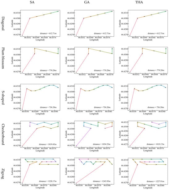 Path planning for the starting point of the sampling vehicle and sampling point coordinates was conducted with the SA algorithm, GA, and THA. The results of path planning (Figure 10) indicated that for the first four sampling methods, the shortest path rates for SA, GA, and THA were 75.83%, 69.17%, and 100%, respectively.