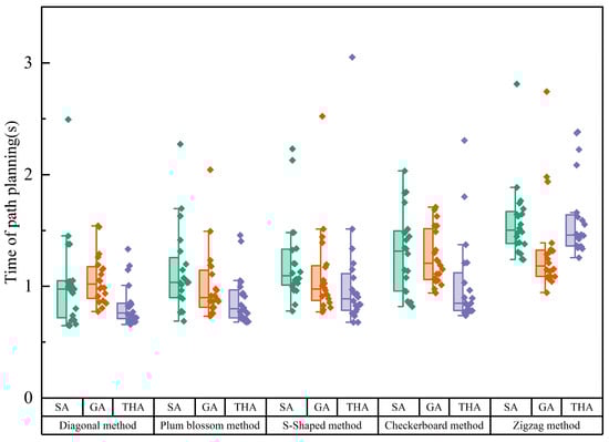 On the basis of the time required by different algorithms for the path planning of sampling points (Figure 11), the average path planning times for the diagonal method, the plum blossom method, the S-shaped method, the checker-board method, and the zigzag method using the SA algorithm were 1.0297, 1.1348, 1.2210, 1.2977, and 1.5776 s, respectively. When the GA algorithm was applied, the times were 1.0651, 1.0063, 1.0991, 1.2673, and 1.3324 s. For the THA algorithm, the corresponding times were 0.8334, 0.8813, 1.0437, 1.0231, and 1.6103 s. The GA yielded the shortest path planning time for the zigzag sampling method. However, the shortest path rate was lower than those of the other two algorithms. The average path planning times for the SA, GA, and THA were 1.2522, 1.1540, and 1.0783 s, respectively. Compared with the SA, the THA reduced the planning time by 13.9%, and compared with the GA, it reduced the planning time by 0.07%, thereby further improving the efficiency of path planning on the basis of sampling points.