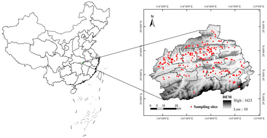 The study area is located in Tongshan County, which is a county-level administrative district belonging to Xianning City, Hubei Province, China, covering an area of roughly 2680 km2. It is situated between 29°20′ N and 29°51′ N, and 114°14′ E and 114°58′ E. Tongshan County is a low-middle mountain hilly region, and topographically, it is high in the north and south and low in the east and west, with several river valley basins in the middle. Tongshan County has an average annual temperature of roughly 17.5 °C, an average annual precipitation of 1500 mm, and an average annual number of precipitation days of 147. Its subtropical monsoon-type with great heat and humidity favors crop cultivation. In Tongshan County, the crops mainly include rice, loquats, and tea. The main soil types include acrisols (39.28%), cambisols (18.56%), leptosols (10.88%), anthrosols (9.95%), and alisols (7.77%).