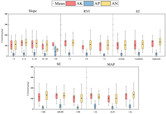 The results of the boxplot statistical analysis of AK, AP, and AN under different slope, RVI, ST, SE, and MAP levels. AK: available potassium; AP: available phosphorus; AN: ammonium nitrogen; RVI: ratio vegetation index; ST: soil type; SE: soil erosion; and MAP: mean annual precipitation.