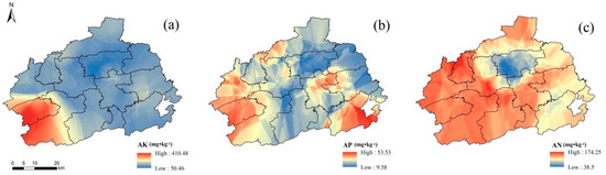 Spatial distribution maps for (a) AK, (b) AP, and (c) AN in the study area. AK: available potassium; AP: available phosphorus; AN: ammonium nitrogen.