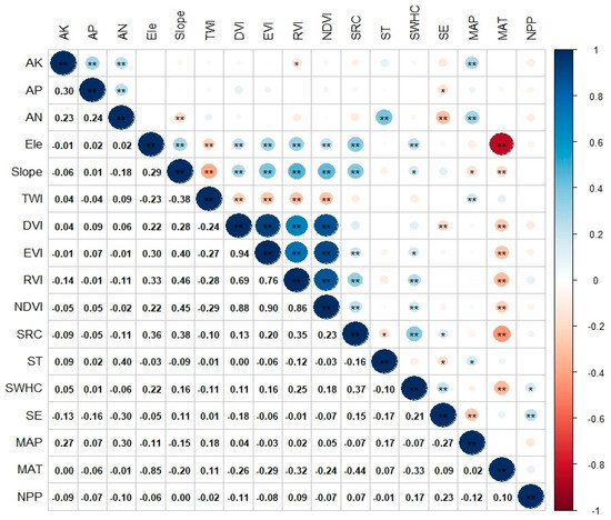 The correlation between environmental variables and AK, AP, and AN. The dot size represents the correlation coefficient value (the larger the dot size, the higher the coefficient value). Positive and negative correlations are indicated by blue and red dots, respectively. AK: available potassium; AP: available phosphorus; AN: ammonium nitrogen; Ele: elevation; TWI: topographic wetness index; DVI: difference vegetation index; EVI: enhanced vegetation index; RVI: ratio vegetation index; NDVI: normalized difference vegetation index; SRC: soil retention capacity; ST: soil type; SWHC: soil water-holding capacity; SE: Soil erosion modulus; MAP: mean annual precipitation; MAT: mean annual temperature; and NPP: net primary production. *, p < 0.05; **, p < 0.01.