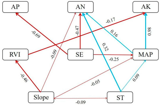 A path model of the relationship between the topography, vegetation index, soil property, climate, and AK, AP, and AN. The thickness of the line represents the importance of environmental factors. Blue indicates a positive correlation, while red denotes a negative correlation. The fitting test results show that the model has desirable fitting ( 2.31, GFI = 0.959, NFI = 0.904). AK: available potassium; AP: available phosphorus; AN: ammonium nitrogen; RVI: ratio vegetation index; SE: soil erosion modulus; MAP: mean annual precipitation; and ST: soil type.
