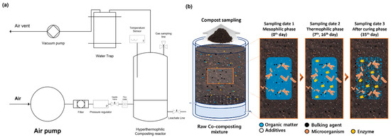 The experiment was conducted in a room at a temperature of 25 ± 2 °C in Kyonggi University, Suwon, Gyeonggi-do, Republic of Korea in 2024. A vertical cylindrical reactor with a working volume of 2 L was manufactured to conduct the experiments. A steel support was installed at the bottom of the reactor to facilitate the smooth discharge of leachate during the composting process. To maintain aerobic conditions, air was injected at a rate of 4 L/min during the composting (Figure 1a). A vacuum pump and a silica gel reactor were installed at the air outlet to remove the generated water. Air was injected every 45 min/h. In addition, the compost was mixed once a week to improve nutrient availability and reduce incomplete decomposition. Each treatment was conducted in duplicate to ensure the reliability and reproducibility of the results.