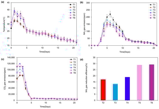 Effects of different treatments on gas emission profiles. (a) Changes in temperature (°C), (b) NH3 (ppm), (c) CO2 (ppm), gas emission profiles, and (d) NH3 reduction efficiency during the composting process (%).