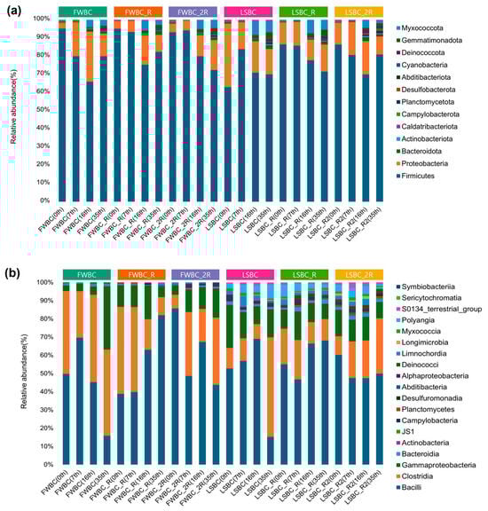 Taxonomic analysis of compost. (a) Phylum-level taxonomic analysis and (b) class-level taxonomic analysis.