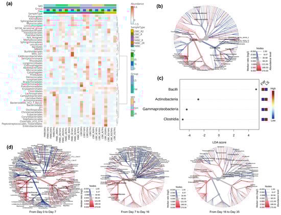 The microbial change between FW and LS diverged significantly in response to Bacillus sp. supplementation. LS treatments retained Firmicutes dominance for a longer period, particularly Clostridia, which maintained stable abundances of 22–25% throughout the composting process. This stability highlights Clostridia’s role in anaerobic or micro-aerobic decomposition, particularly for nitrogen-rich substrates (Figure 3). In contrast, FW treatments transitioned more rapidly to microbial communities dominated by Proteobacteria and Bacteroidota, favoring the degradation of plant-derived organic matter. By day 35, Firmicutes had lost dominance in FW treatments, particularly those supplemented with Bacillus sp. Proteobacteria, primarily represented by Pseudomonadales and Enterobacterales, comprised up to 35% of the microbial community in Bacillus sp.-supplemented FW treatments, underscoring their importance in nitrogen cycling and the degradation of recalcitrant organic matter during the final composting stages. Similarly, Bacteroidota reached an abundance of 15% in non-supplemented FW treatments, contributing to the breakdown of complex carbohydrates. The supplementation of Bacillus sp., particularly at double dosages, significantly influenced microbial succession in FW treatments. These treatments exhibited higher microbial diversity and faster transitions from Firmicutes to Proteobacteria and Bacteroidota, resulting in a more balanced microbial community and more complete decomposition by day 35 compared to non-supplemented treatments (Figure 4). LEfSe analysis was conducted to identify microbial taxa significantly enriched in FW and LS groups, with thresholds set at p < 0.01 and LDA score >2. The results provide additional insights into the taxonomic differentiation between the two substrate groups. Bacilli were significantly enriched in FW (p = 0.0012, FDR = 0.022, LDA score = 5.02), with a relative abundance of 640,200 compared to 430,520 in LS. This highlights Bacilli’s key role in organic matter decomposition and nutrient cycling in FW treatments. Clostridia were significantly enriched in LS (p = 0.0056, FDR = 0.050, LDA score = −4.87), with a relative abundance of 331,300 in LS compared to 182,480 in FW. The dominance of Clostridia underscores their involvement in lignocellulosic degradation and fermentation processes characteristic of manure substrates. Gammaproteobacteria (LDA score = −4.34) and Actinobacteria (LDA score = −2.77) were more abundant in LS, with relative abundances of 146,800 and 3015.7, respectively, compared to 103,340 and 1829 in FW. These taxa likely play specialized roles in lignocellulosic substrate degradation.