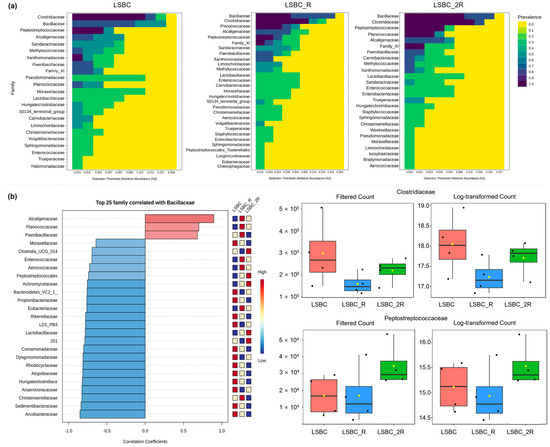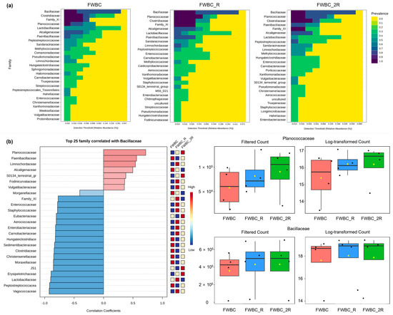 In the FWBC group, positive correlations constituted 33.63% of the total number of edges, while negative correlations accounted for 66.37%. Supplementation of Bacillus sp. in the FWBC_R treatment increased the proportion of positive correlations slightly to 37.39%, whereas that of negative correlations decreased to 62.61%, indicating a slight shift towards more cooperative interactions. However, in the FWBC_2R treatment, positive correlations decreased again to 31.51%, while negative correlations increased to 68.49%, suggesting that higher doses of Bacillus sp. increased competitive or inhibitory interactions. In the LSBC group, the proportion of positive correlations was higher, accounting for 40.62%, while negative correlations accounted for 59.38%. After the addition of Bacillus sp., the FWBC_R treatment showed a decrease in positive correlations to 33.65%, whereas negative correlations increased to 66.35%, reflecting a shift towards more antagonistic interactions. Notably, in the FWBC_2R treatment, the network displayed a different trend, with positive correlations increasing to 42.01% and negative correlations decreasing to 57.99%, suggesting that higher Bacillus sp. dosage might have re-established cooperation within the microbial community or alleviated certain competitive dynamics [53]. Network centrality analysis revealed significant structural shifts in microbial interactions. Eigenvector and betweenness centralities showed a decreasing trend with the addition of Bacillus sp. across both the FWBC and LSBC groups. A decrease in eigenvector centrality indicates a reduction in the influence of highly connected and influential microbial nodes within the network [54]. Nodes that were once central in terms of connectivity and association with other influential nodes lost their dominance as Bacillus sp. altered the microbial composition. Similarly, the decrease in betweenness centrality suggests that key nodes involved in bridging disparate communities or acting as intermediaries in the flow of biological interactions play a diminished role [54]. This could reflect a restructuring of the network, where specific microbial taxa were less critical for maintaining network integrity when Bacillus sp. were introduced. By contrast, closeness and harmonic centralities exhibited increasing trends, signifying a shift towards a more efficient and tightly connected network structure. The increase in closeness centrality indicated that the microbes, on average, were more closely connected within the network, leading to a reduction in the overall path length between the nodes [55]. The addition of Bacillus sp. may have facilitated direct and efficient microbial interactions, thereby enhancing communication across the community. Moreover, the increase in harmonic centrality supports this observation, as it reflects the improved overall accessibility of microbes within the network, even in cases of indirect connections. This pattern implies that Bacillus sp. contributed to a more cohesive and interactive microbial network, despite the presence of competing or antagonistic interactions (as indicated by the negative correlation increase in FWBC_2R).