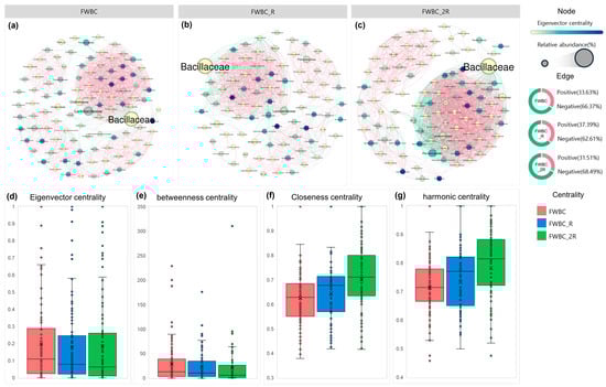 Microbial co-occurrence network of (a) FWBC, (b) FWBC_R, (c) FWBC_2R, and (d) network structure analysis with eigenvector centrality, (e) betweenness centrality, (f) closeness centrality, and (g) harmonic centrality metrics.