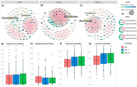 Microbial co-occurrence network of (a) LSBC, (b) LSBC_R, (c) LSBC_2R, and (d) network structure analysis with eigenvector centrality, (e) betweenness centrality, (f) closeness centrality, and (g) harmonic centrality metrics.