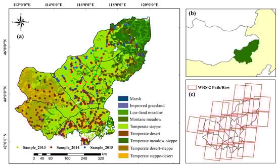 (a) Grassland types and field samples distribution, (b) geographical location, (c) Landsat scenes of the study area.