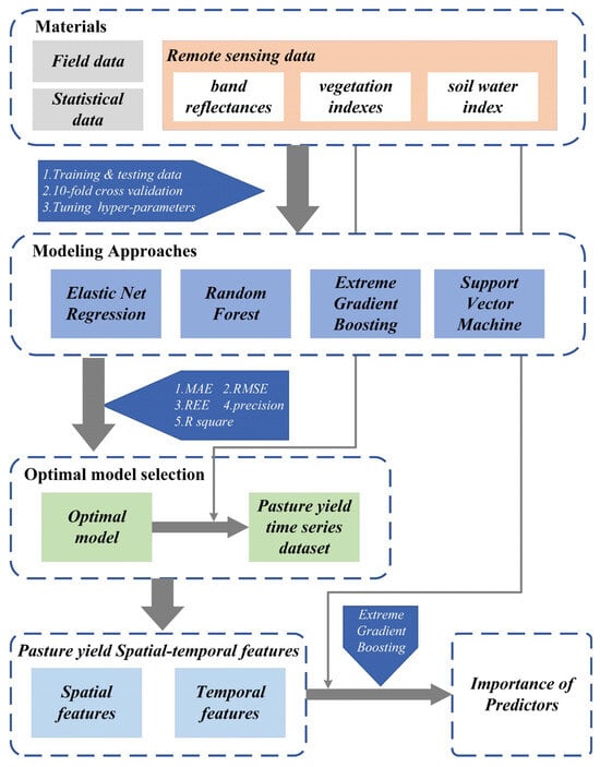 The remote sensing-based methods for pasture yield estimation can generally be summarized in two kinds: parametric regression methods and non-parametric machine learning algorithms [18]. The parametric regression methods usually establish the assumed function between yield measurements and vegetation indexes (VIs). Normalized difference vegetation index (NDVI) is the most widely used VI for pasture yield estimation [19,20,21,22]. Beyond that, other VIs have also been used for pasture yield estimation, such as enhanced vegetation index (EVI), ratio vegetation index (RVI), difference vegetation index (DVI), soil adjusted vegetation index (SAVI), modified soil adjusted vegetation index (MSAVI), and so on [2,8,23,24]. Machine learning algorithms, e.g., artificial neural network (ANN), Support Vector Machine (SVM), Random Forest (RF), and Extreme Gradient Boosting (XGBoost), are able to fit a large number of functional forms between yield measurements and satellite sensor observations, including reflectance of bands and their corresponding VIs. Compared with parametric regression models, non-parametric machine learning is advantageous in handling multiple nonlinear and even more complex relationships, more efficient in selecting the critical predictors from a large number of predictors [25], and less sensitive to the data noises [26]. More importantly, some studies have proved that machine learning algorithms perform superiorly in simulating and predicting pasture yield. For example, Liu et al. [27] compared the performance of Multivariate Stepwise Regression (MSR), RF, SVM, and Convolutional Neural Network (CNN) in estimating pasture yield management, with the RF model showing significantly better performance. Similarly, Tang et al. [28] employed the RF model to estimate pasture yield in the headwater of the Yellow River, revealing that the yield values predicted by the RF model (R2 = 0.68) were closer to the observed values compared to other models (R2 = 0.41). Wang et al. [29] utilized the RF algorithm to estimate pasture yield in the Three-River Headwaters Region. The results indicated that compared to other models, the RF model predicted pasture yield values closer to the observed values (R2 = 0.6). Fei et al. [30] accurately estimated crop yield using elastic net regression (Enet), which can handle highly correlated input variables. Pham et al. [31] found that XGBoost (R2 = 0.805) was more effective in pasture yield estimation than other algorithms such as SVR and GPR. Liang et al. [32] compared the performance of SVM, RF, XGBoost, and stepwise multiple linear regression in pasture yield estimation, showing that SVM had the highest estimation accuracy (R2 = 0.752).