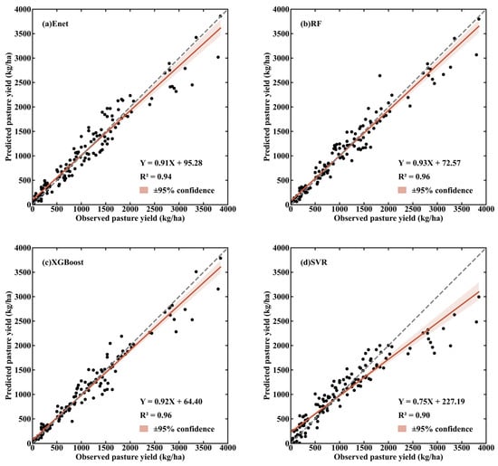 Figure 3 demonstrates that the four models performed well in estimating pasture yield, with the XGBoost model achieving a slightly superior fit, particularly at lower yield levels. The R2 between XGBoost-derived and observed yield was 0.96, and the predicted points were very close to the 1:1 line. For all models, the fitting accuracy declined with increasing yield, attributed to insufficient training samples for high yield values. The median and average values were 896 and 1041.46 kg/ha, indicating that most yield training samples fell below 1000 kg/ha, and the training samples were not enough for the yield with high values. Consequently, this resulted in greater prediction errors for regions with high yield. In addition, the vegetation index is too easily saturated to reflect yield effectively under conditions of high yield, contributing to this problem [5].