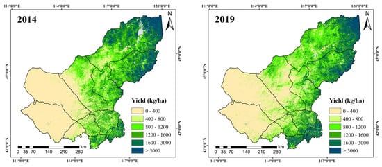 Spatial distributions of pasture yield in the Xilingol grassland for 2014 and 2019.