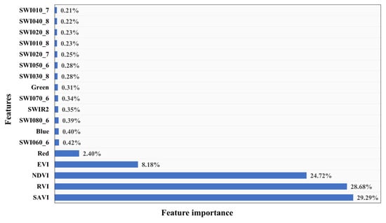 To identify the critical factors for pasture yield prediction in the study area, we analyzed the importance of the top 18 predictors from the XGBoost model (Figure 6). SAVI was ranked as the first important factor for pasture yield prediction in the Xilingol grassland, followed by RVI, NDVI, and EVI. The superior performance of SAVI is primarily attributed to its ability to effectively mitigate the influence of soil background, especially in areas with low vegetation cover. This is because SAVI adjusts for soil spectral reflectance, allowing it to more accurately reflect the true condition of vegetation, particularly in the arid or semi-arid conditions of Xilingol grassland, where soil background can significantly interfere with the performance of traditional VIs (such as NDVI). Furthermore, the sensitivity of SAVI to soil moisture variation makes it particularly outstanding under specific climatic conditions. In our study area, soil moisture levels play a crucial role in pasture growth, and SAVI is more effective in capturing this influence, especially during critical periods of vegetation growth. During this time, variations in soil moisture significantly impact pasture yield, further highlighting the importance of SAVI compared to other VIs. In addition, the mean RMSEs of the feature of importance in 10-fold cross-validation for SAVI, RVI, NDVl, and EVI are 4.44%, 5.56%, 3.2%, and 1.83%, respectively, this means the SAVI presents a stable feature importance, compared with the other VIs with high feature importance, e.g., RVl. Except for VIs, the surface reflectances of the red and blue bands along with soil moisture levels in June were also identified among the top 10 predictors. Numerous studies have shown that the vegetation growing season (SOS) typically begins in late April or early May in China’s temperate grasslands, with vegetation growth peaking in June [60,61]. Thus, the soil water content in June played a more significant role for pasture yield of the temperate grassland than that in July and August.