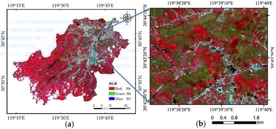 Anji Sentinel-2 satellite imagery (a) and its zoomed-in section (b). The images were acquired on 3 June 2019, using bands B8 (near-infrared), B4 (red), and B3 (green) for false-color composite, representing red, green, and blue, respectively.