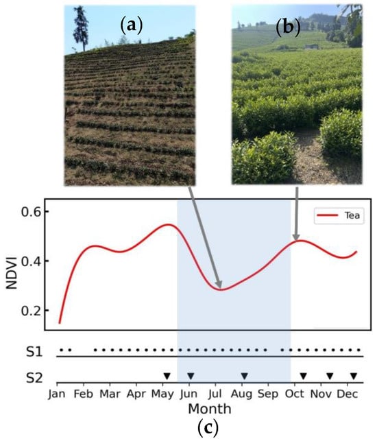 The acquisition dates of Sentinel-2 (S2) and Sentinel-1 (S1) satellite images in the study area, as well as the time series NDVI curves of tea plantations (c). The time series NDVI curves of tea plantations were derived from Sentinel-2 images of tea gardens within the study area that were not obscured by clouds in 2019. Blue area represents the period of NDVI decrease and recovery caused by intensive pruning of Anji white tea plants. (a,b) were taken on-site at tea gardens during the period indicated by the arrows.