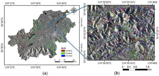 Anji Sentinel-1 satellite imagery (a) and its zoomed-in section (b). The image was synthesized through false-color composite using Sentinel-1 VV imagery from 1 May, 1 June, and 1 October 2019, as red, green, and blue channels, respectively.