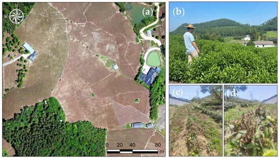 The drone imagery (a) and on-site photographs (b–d) of the tea garden in Anji. (b) illustrates the tea garden in its pre-pruning state, whereas (c,d) depict the post-pruning condition of the tea garden.