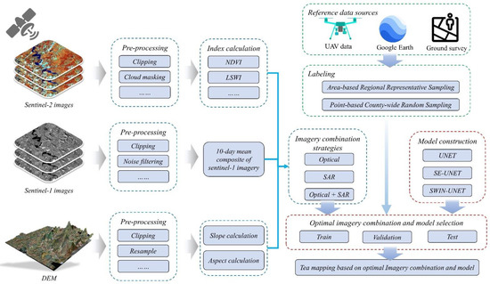 The technical workflow for tea plantation mapping is illustrated in Figure 6. Firstly, Sentinel-1, Sentinel-2, and DEM data within the study area are collected and processed to form three different image combinations: optical, SAR, and optical + SAR, serving as input data sources for tea plantation mapping. Secondly, based on UAV imagery, ground survey data, and high-resolution imagery from Google Earth, point-based random sample labels covering the entire county and area-based sample labels of typical regions are created for model training, validation, and testing purposes. Thirdly, multiple deep learning models for tea plantation mapping based on semantic segmentation are constructed, leveraging skip connections, attention mechanisms, and other techniques to fully exploit the rich spatiotemporal spectral features in multi-source satellite imagery for precise tea plantation mapping. Finally, by comparing the accuracy of datasets and models, the optimal dataset and model for tea plantation mapping are selected to achieve high-precision mapping, and techniques such as spatial analysis, spectral analysis, and temporal analysis are employed to summarize the unique spatial, spectral, and phenological characteristics of Anji white tea, providing valuable insights for enhancing tea plantation mapping capabilities.
