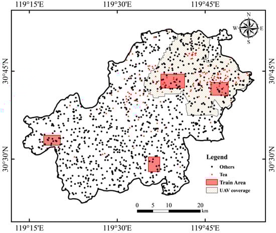 Both the polygonal and point samples were meticulously curated to ensure their representativeness and accuracy (Figure 7). The area of polygonal samples comprised four sub-regions scattered across Anji, totaling approximately 76.13 km2. Two of these sub-regions were located in the northeastern part of Anji’s main tea-producing area, while the other two were situated in the southeastern and southwestern parts of Anji, where only a small number of tea gardens were distributed, thus ensuring the representativeness of the sample region. The polygonal samples were used as training and validation data. Additionally, the point samples consisted of 1294 sample points spanning the entirety of Anji County, generated randomly and uniformly distributed. The labeling of both types of samples was derived from various sources, including drone imagery, very high-resolution Google imagery, ground truth survey data, and others, ensuring the precision and reliability of the label data.