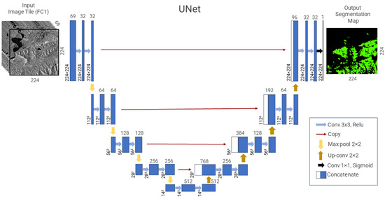 The UNet model is a classic semantic segmentation network that evolved from the fully convolutional network [36]. It adopts a symmetric encoder–decoder architecture and incorporates skip connections in the decoder to fuse high-level semantic information with low-level features, thereby enhancing segmentation accuracy and mitigating information loss during the process (Figure 8). Specifically, the UNet architecture is as follows: on the left side of the model are four consecutive downsampling encoder layers. Each layer undergoes two 3 × 3 convolution operations followed by ReLU activation and then downsampling through a 2 × 2 max-pooling layer, doubling the feature maps while halving the spatial resolution. With the increase in network depth, features of different scales are extracted, and after four consecutive downsampling steps, the model captures more abstract global features, with the receptive field gradually increasing and the spatial resolution decreasing to 1/16 of the original. In the decoding process, symmetric upsampling operations are employed. With each upsampling layer, the number of features is halved while the spatial resolution is doubled. Skip connections are utilized during upsampling by concatenating the corresponding downsampled features with the decoder features to recover local detail features lost during downsampling. After four upsampling layers, the image is restored to its original size, followed by convolution with a 1 × 1 kernel and sigmoid activation to obtain the final image segmentation result. This architectural design enables the UNet model to exhibit excellent performance in tasks such as remote sensing image segmentation, effectively addressing issues such as inaccurate segmentation and information loss.