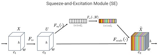 The squeeze-and-excitation (SE) attention module (Figure 9) is a type of channel attention module commonly applied in visual models. Through it, channel-wise feature enhancement can be performed on input feature maps without altering their size [37]. Specifically, it first passes the input through a standard convolution operation to obtain feature maps. The formula is defined in Equation (7).