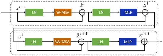 The ST block module is detailed as shown in Figure 11, comprising a LayerNorm (LN) layer, a multi-head self-attention module, residual connections, and a multi-layer perceptron (MLP) with a GELU activation function. The difference between the two consecutive ST blocks lies in the adoption of the window-based multi-head self-attention (W-MSA) module and the sliding window-based multi-head self-attention (SW-MSA) module in the two blocks. Following this mechanism, consecutive STs are defined in Equations (11)–(14).
