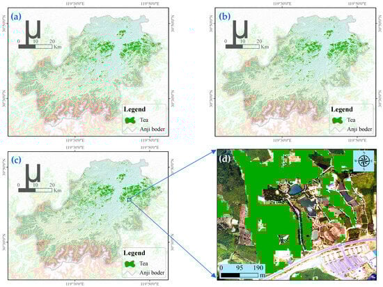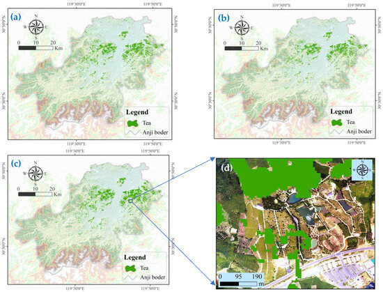 Tea plants constitute a significant economic crop cultivated globally, playing a pivotal role in fostering the prosperity of international agricultural trade [1]. China, as the country of origin for tea, has abundant tea cultivation resources [2]. In 2019, China’s tea plantation area was 3,185,311 hectares, accounting for 61.9% of the global tea plantation area, making it the largest tea producer worldwide [3,4]. Accurate spatial information concerning tea plantations is indispensable for purposes such as area statistics, yield estimation, and the optimization of industrial layouts. Traditionally, information on tea plantations has been gathered through on-site surveys and multi-tiered reporting by local authorities, a method that is heavily influenced by human factors, time-consuming, labor-intensive, and incapable of providing continuous, large-scale spatial monitoring. Consequently, the efficient and precise acquisition of the spatial distribution of tea plantations is an imperative issue that demands immediate attention.