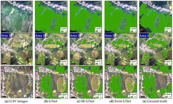 Using randomly sampled points covering the entire research area for accuracy verification, the SWIN-UNet model achieves the highest accuracy, with an overall accuracy of 0.993, an F1-score of 0.977, a precision of 0.989, and a recall of 0.964. Compared to the tea plantation mapping based on SAR data, these accuracy metrics have improved by 4.30%, 18.57%, 7.03%, and 29.57%, respectively. This high level of accuracy indicates a significant improvement in the ability to identify tea plantations using optical data over SAR data. The substantial increase in the recall suggests that optical data can significantly reduce the omission of tea plantations. This improvement can also be observed in Figure 14d, where, compared to Figure 13d, the use of multi-temporal optical imagery and the SWIN-UNet model effectively identifies tea plantations in complex backgrounds, reducing the omission of tea plantations.