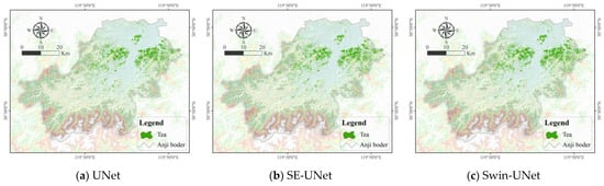 Among the three tea plantation mapping methods, those incorporating attention mechanisms, specifically SE-UNet and SWIN-UNet, achieved the highest classification accuracy. The SE-UNet model attained the highest accuracy in cross-validation, with an overall accuracy of 0.946, an F1-score for tea plantations of 0.850, and both precision and recall of 0.850. This indicates that within the sample area, the proportions of misclassified and omitted tea plantations are relatively balanced, with approximately 15% of tea plantations misclassified as other land types and about 15% of pixels classified as tea plantations actually being non-tea plantation pixels.