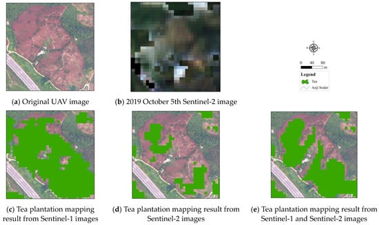 Tea plantation mapping results in cloud-affected areas based on different image combinations. (a) UAV image, (b) Sentinel-2 image, (c) Sentinel-1 derived tea plantation map, (d) Sentinel-2 derived tea plantation map and (e) tea plantation mapping result based on combined Sentinel-1 and Sentinel-2 data.