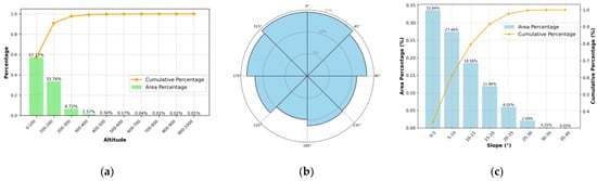 Relationship between distribution of Anji tea gardens and altitudes, aspects, and slopes. (a) Percentage of tea gardens distributed at different altitudes; (b) percentage of tea gardens distributed at different aspects; (c) percentage of tea gardens distributed at different slopes.