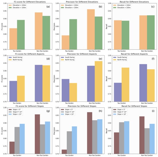 Tea plantation accuracy under different terrain conditions. (a–c) show the impact of elevation on the F1-score, precision, and recall of tea plantation classification, respectively. (d–f) depict the effect of aspect on the F1-score, precision, and recall of tea plantation classification. (g–i) illustrate the influence of slope on the F1-score, precision, and recall of tea plantation classification.