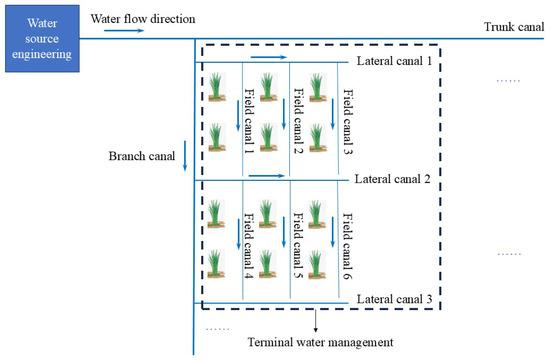 Irrigation districts typically receive water from a source engineering system, which is then transported through a series of canals [29,30]. Water is first diverted from the source to the trunk canals, followed by distribution through branch canals and final canals (including lateral and field canals), which deliver water directly to the fields [29,30], as shown in Figure 1. Terminal water management, which integrates the processes of final canal water delivery and field irrigation, can be categorized into two components: field water management and final canal water delivery management. Traditionally, these two components have been managed independently. Final canal water delivery management involves transporting water to the fields through the final canals, but without adapting to specific field-level irrigation needs, which can lead to mismatched water distribution, causing either shortages or excesses. Field water management entails the rational allocation of water resources in the field according to crop water requirements during growth stages. However, when applied without consideration of final canal water delivery, it may overlook actual water availability at the field level, leading to suboptimal irrigation practices. By integrating these two components into a cohesive approach termed ‘terminal water management’, the allocation of water from final canals to fields can be optimized, enhancing irrigation efficiency, minimizing waste, and better aligning water supply with crop requirements.