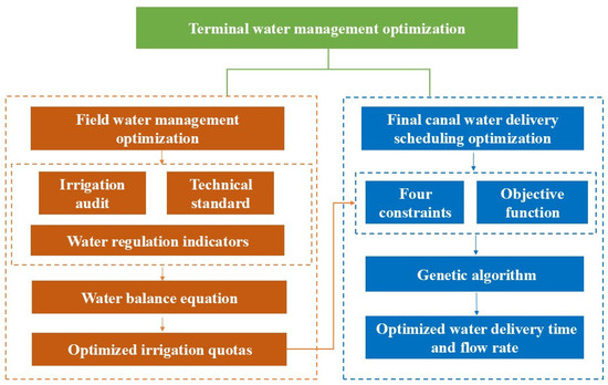 To optimize terminal water management, we considered an irrigation audit, a canal water delivery scheduling optimization model, and a genetic algorithm. The optimization procedure consists of two steps, with the flowchart of the method shown in Figure 2.