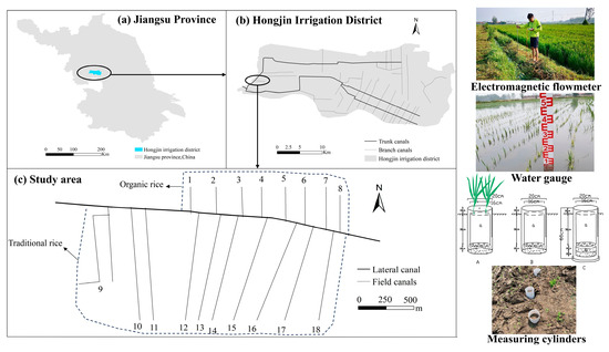 The Hongjin irrigation district, located in Huaian, Jiangsu Province, China, is a significant large-scale irrigation district, covering approximately 23,853 hm2 of designed irrigation area. As shown in Figure 3, the study area was selected within the Zijing Company’s farm in the Hongjin irrigation district. Zijing Company has established a 360 hm2 farm in the Hongjin irrigation district, primarily cultivating rice. The rice cultivated by the company is processed and directly distributed through its affiliated stores. Zijing Company primarily cultivates two types of rice: traditional rice and organic rice. The company’s organic rice fields serve as its flagship green demonstration products, which are progressively being promoted across other areas of the Hongjin irrigation district. The study area includes one lateral canal and eighteen field canals. Both the lateral and field canals are concrete-lined and remain in relatively good condition, ensuring normal water conveyance during irrigation. We selected one 1 hm2 plot of traditional rice and another 1 hm2 plot of organic rice, both cultivated by local farmers, and monitored the water management and crop management from May to October 2020.