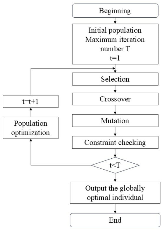(7) Constraint checking. Based on practical requirements, a constraint-checking step was added to the iterative process of the genetic algorithm [60]. Each new chromosome generated by the crossover and mutation operators is checked against the problem’s constraints and any solutions that fail to meet the constraints are discarded [59].