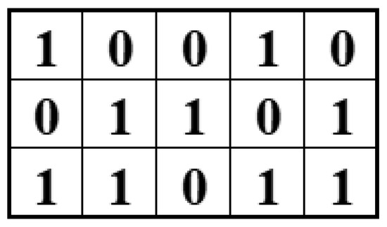 (1) Encoding. Encoding is the process of converting potential solutions to an optimization problem into chromosome form, which is the first step of the genetic algorithm [52,53,54]. In this study, binary matrix encoding was adopted. Specifically, each chromosome consists of an 18 × 5 two-dimensional gene matrix, where each row represents an individual canal and each column corresponds to a specific time period. The gene value “1” holds a special meaning here, indicating that irrigation is taking place. For example, if the gene value in the ith row and jth column is 1, it means that canal i will perform irrigation during time period j.