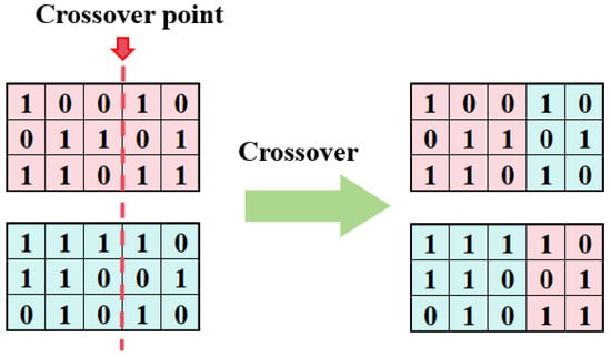 (5) Crossover operator. The crossover operator simulates the phenomenon of reproduction, achieving the exchange of genetic material between two parent individuals with a certain probability, thereby producing new offspring [58]. In this study, a fixed single-point crossover operator was selected. Specifically, this operator randomly selects two chromosomes and performs crossover at a fixed position (between the third and fourth columns) in the gene matrix, as illustrated in Figure 6.