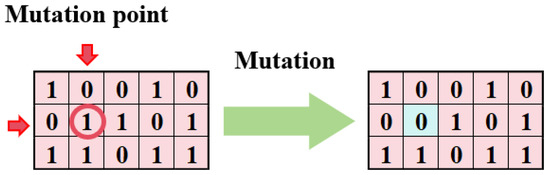 (6) Mutation operator. The mutation operator simulates the gene mutation phenomenon in biological evolution, generating new genetic combinations by randomly altering some genes in the parent individuals [52]. This process increases population diversity, effectively broadens the exploration of the solution space, enhances the algorithm’s global search capability, and helps to avoid premature convergence to local optima [62]. In this study, a basic bit mutation strategy was adopted. The specific operation involves randomly selecting a gene position in the chromosome as the mutation point, and then performing a bit-flip operation at that position. As shown in Figure 7, if the original gene value is 0, it is replaced with 1, and vice versa.