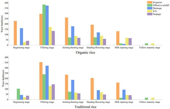 To assess the actual field water management conditions, the data for the irrigation, effective rainfall, drainage, ETc, and seepage for organic and traditional rice during the 2020 growing season, as observed through a field investigation and irrigation audit, are illustrated in Figure 8. Irrigation for both organic and traditional rice increases initially, peaks at the tillering stage, and then decreases. The tillering stage is characterized by the longest growth cycle and rapid development rates in rice, resulting in the highest irrigation amount.