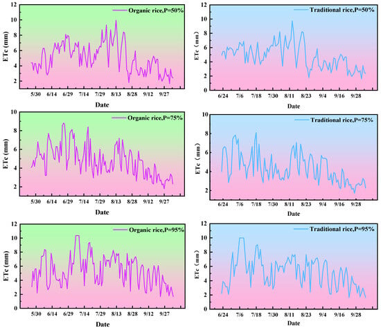 According to meteorological data from 1951 to 2020, three hydrological frequency years (P = 50%, 75%, and 95%) were identified using the curve fitting method. The crop evapotranspiration (ETc) for organic rice and traditional rice during these hydrological frequency years was estimated using the FAO-56 Penman–Monteith method, as illustrated in Figure 9. The ETc values for the two rice types differ significantly across the three hydrological frequency years. Based on our 2020 measurement data, the growth cycle of organic rice is 28 days longer than that of traditional rice. Furthermore, physiological properties such as plant height and spike length of organic rice are approximately 15% greater than those of traditional rice, leading to a higher water layer requirement for organic rice. Consequently, the ETc of organic rice is generally higher than that of traditional rice. The maximum ETc for both rice types occurs during the late tillering stage and the jointing and booting stage. The sum ETc across the three hydrological frequency years follows the order P = 95% > P = 50% > P = 75%. The multi-year average ETc for organic rice and traditional rice is 676 mm and 503 mm, respectively. Using the water balance equation and the appropriate field water regulation indicators from Table 1, the optimized irrigation schedules for organic and traditional rice across the three hydrological frequency years were simulated. The corresponding optimized irrigation quotas are presented in Table 2.