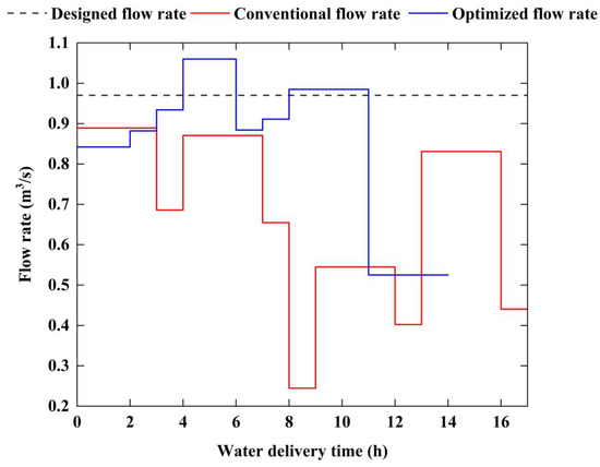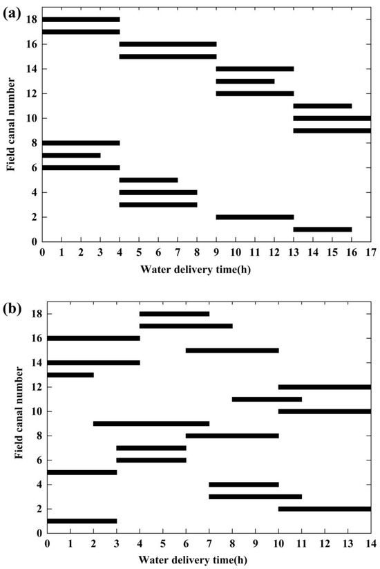 Traditionally, canal water delivery scheduling followed the principle of irrigating the field canal furthest from the lateral canal first. The conventional and optimized field canal water delivery scheduling are shown in Figure 10. When the conventional method was replaced with the optimized scheduling, the water delivery time was reduced from 17 h to 14 h and the ratio of seepage losses to total water delivery was reduced from 6.3% to 4.6%. There are approximately 10–15 similar irrigation events during the rice growth period. Therefore, if the optimization method is adopted, the water delivery time can be significantly shortened and agricultural water resources can be effectively conserved.