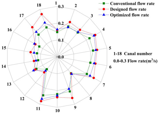 As shown in Figure 11 and Figure 12, in the conventional approach, the ratios of the actual flow rate to the designed flow rate of the lateral canal range from 0.25 to 0.91, while those of the field canals range from 0.69 to 0.95. It is evident that the actual flow rate of the lateral canal varied significantly and the actual flow rates of the field canals were relatively low compared to their designed flow rates. In contrast, under the optimization approach, the mean actual flow rate of the lateral canal was 0.8 times the designed flow rate. The ratios of the actual to designed flow rates for the field canals ranged from 0.8 to 1.08, indicating that the optimized flow rate remained relatively stable throughout the entire duration and was closer to the designed flow rate than in the conventional approach.