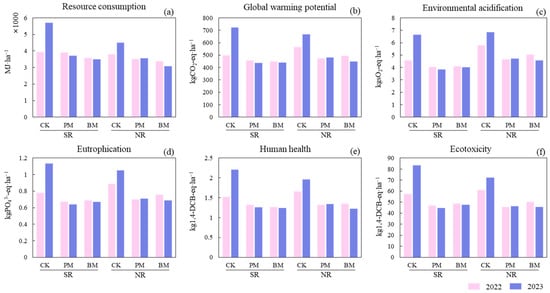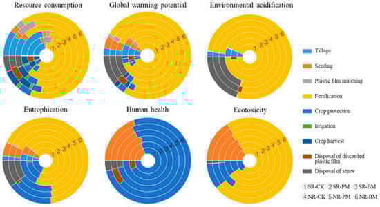3.3. Life Cycle Environment Impact Indexes and Evaluation Results of Straw Returning or Film Mulching on the Six Endpoint Damages per Hectare